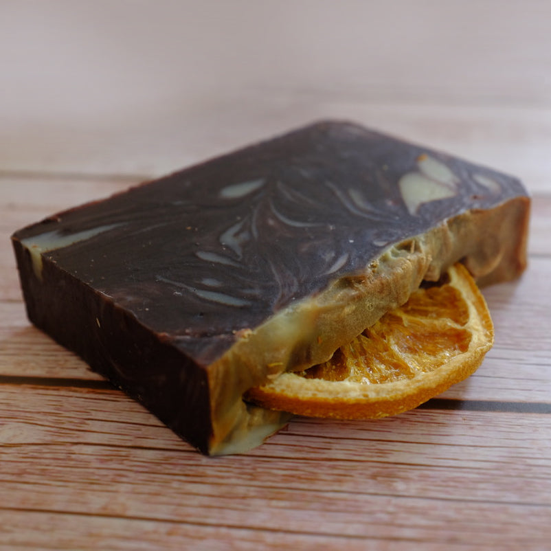Olive Oil (Sodium Olivate), Coconut Oil (Sodium Cocoate), Glycerin (naturally occurring), Water (Aqua), Shea Butter (Sodium Shea Butterate), Castor Oil (Sodium Castorate), Cocoa Powder (Theobroma Cacao Seed Powder), Orange Essential Oil (Citrus Sinensis Peel Oil), Cocoa Butter (Theobroma Cacao Seed Butter). Decorations: (not edible!) Dried Orange Slices (citrus aurantium sinensis L.) Essential Oils naturally contain: limonene.
